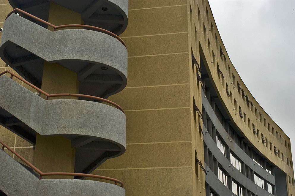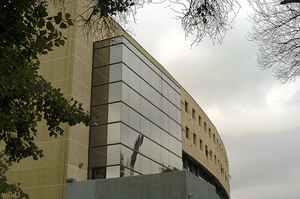 El juego de diferentes planos, el tratamiento del tamaño de las ventanas, el contraste de colores y por último la sutil curva del volumen, hacen que la idea del gran portal se potencie de manera clara y evidente.